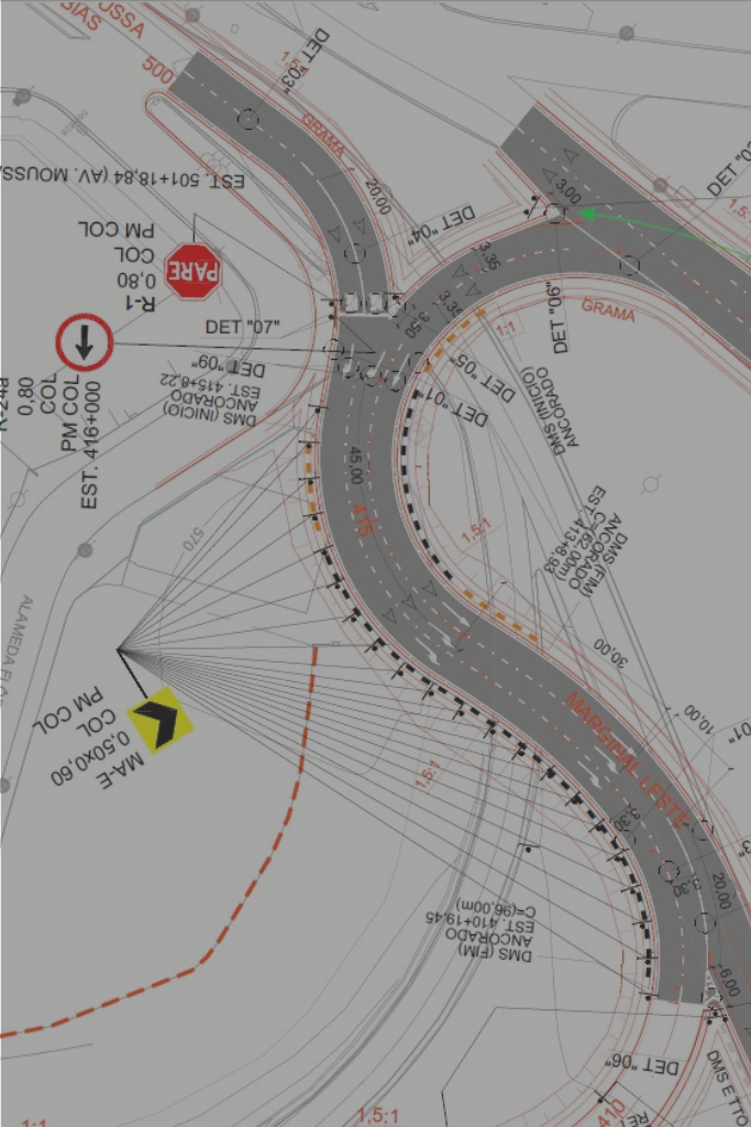 Projetos técnicos completos de sinalização horizontal e vertical baseados em estudos de tráfego e normas regulamentadoras, promovendo segurança viária e fluidez do trânsito.